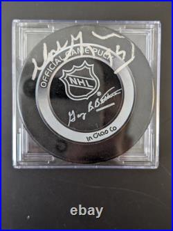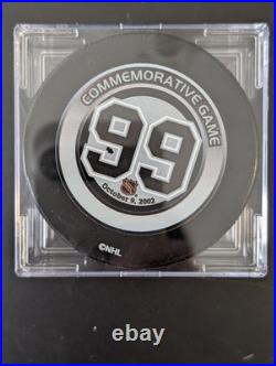 Wayne Gretzky Autographed Puck from his Commemorative Game with the Los Angeles Kings on October 9, 2002. This original item is a must-have for any hockey fan, featuring a signature from'The Great One' himself.