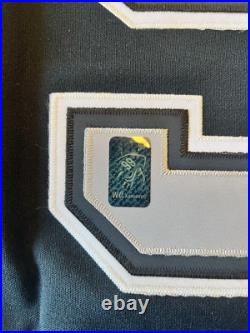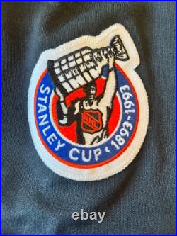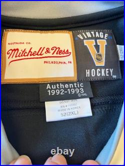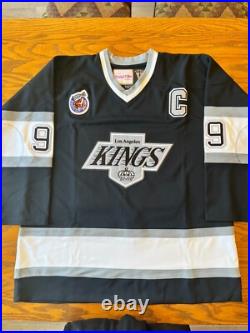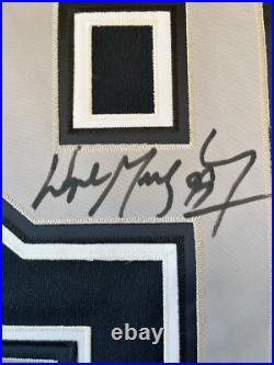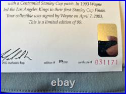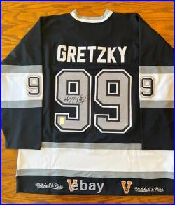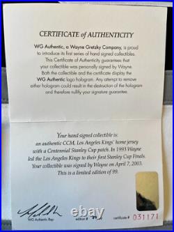 Authentic Mitchell & Ness Vintage Hockey jersey (1992-93 LA Kings style). Signed by Wayne Gretzky on the first "9" of his legendary #99. Tamper-proof hologram affixed to the same numeral.Certificate of Authenticity dated April 7, 2003 - serial #031171. Limited Edition: Individually numbered 83 of 99 ever made. Fight strap (authentic, not replica). Condition: Excellent - previously framed, now boxed and well preserved. The included Certificate of Authenticity lists the jersey as "CCM" - a common clerical error from early 2000s authentication records.